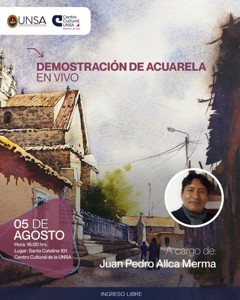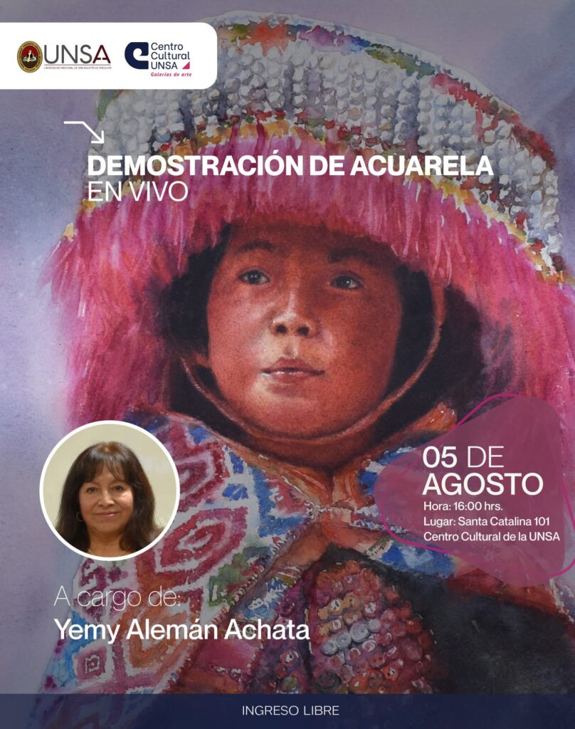 El arte y la memoria se unen en una jornada especial este lunes 5 de agosto, cuando los artistas Juan Pedro Allca Merma y Yemi Alemán Achata realizarán una demostración en vivo de acuarela como parte de la exposición colectiva “Quechuas y Aymaras”. La actividad se llevará a cabo a partir de las 5:00 p.m. en el Centro Cultural UNSA, ubicado en Santa Catalina 101.