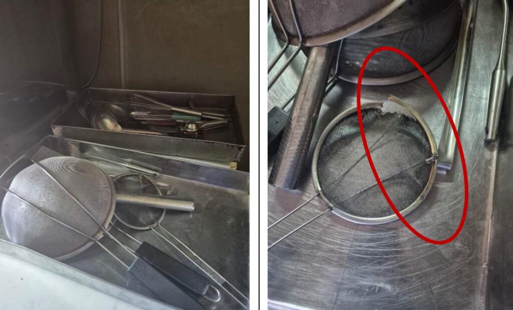 La segunda situación adversa identificada por el informe se refiere al estado de los utensilios de cocina y la gestión de residuos. Se observaron coladores rotos, cucharones guardados en recipientes sin tapa y ollas deterioradas y cubiertas de tizne. Estas condiciones, además de ser antihigiénicas, atentan contra la inocuidad de los alimentos. En paralelo, los tachos para residuos orgánicos —ubicados cerca de la zona de preparación— no contaban con tapa ni rótulos, lo que puede atraer plagas y agravar el riesgo sanitario.