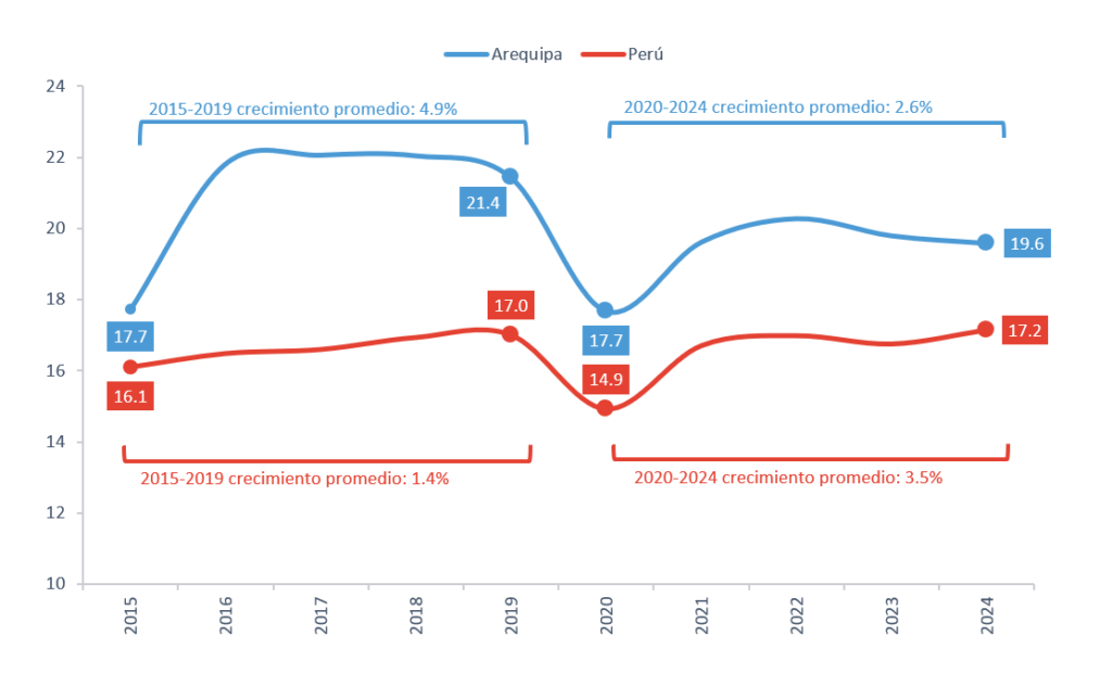 Entre 2015 y 2019, el PBI per cápita de Arequipa creció a un promedio anual de 4.9 %, casi cuatro veces más que el promedio nacional (1.4 %). Sin embargo, desde 2020 la dinámica se ha ralentizado: aunque mantiene un crecimiento promedio de 2.6 % anual, este se ubica por debajo de la media nacional (3.5 %). En consecuencia, el PBI per cápita de la región aún no recupera su nivel prepandemia, según reciente informe del Instituto Peruano de Economía (IPE).