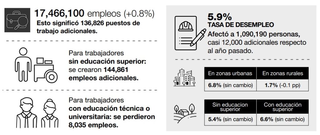 En total, durante el segundo trimestre del año, el país generó 136 826 empleos adicionales, aunque el resultado tuvo matices. Para los trabajadores sin educación superior se crearon 144 861 nuevos empleos, mientras que aquellos con estudios técnicos o universitarios experimentaron una caída de 8 035 puestos.