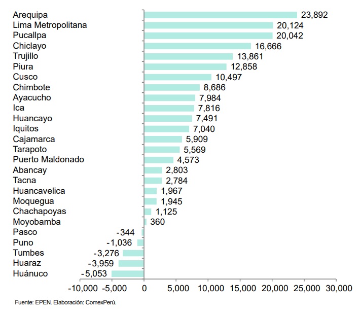 En total, el empleo aumentó en 21 de las 26 ciudades evaluadas, siendo Arequipa la que más aportó, seguida por Lima y Trujillo.