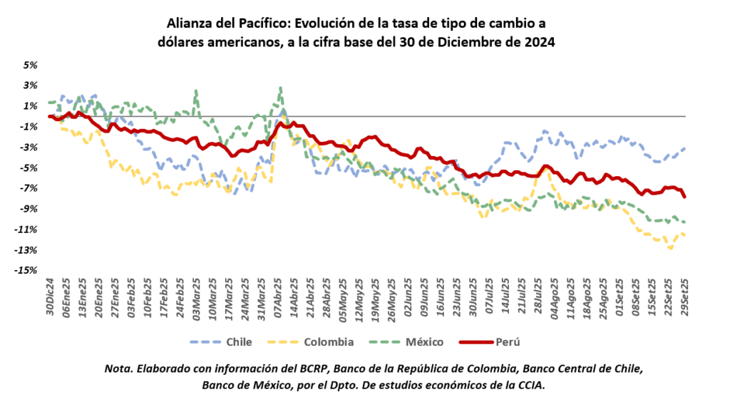 Desde finales de 2024 y durante 2025, el sol peruano registró una apreciación sostenida frente al dólar, impulsada por la combinación de factores globales y fundamentos locales. Al cierre de septiembre de 2025, la moneda peruana se fortaleció en 7.8 % respecto a la cifra base del 30 de diciembre de 2024. En comparación, el peso chileno se apreció en 3.1 % respecto al mismo periodo, el peso colombiano en 11.5 % y el peso mexicano en 10.2 %.
