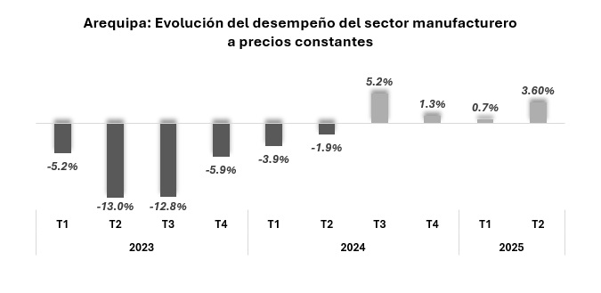 Ya en 2025, la manufactura regional reforzó ese crecimiento, registrando incrementos de 0,7% y 3,6% en los dos primeros trimestres, respectivamente. Este avance respondió a una mayor estabilidad productiva, apoyada en la recuperación de la agroindustria, el dinamismo del mercado interno y la normalización del suministro energético. La incidencia positiva de ramas como alimentos, bebidas y materiales de construcción fue determinante, reflejando la reactivación del consumo local y la inversión privada en proyectos menores. Es por ello que estos resultados confirman que el impulso iniciado en 2024 no fue coyuntural, sino parte de una etapa de reactivación estructural, en la que la manufactura arequipeña se consolida como un sector fundamental para el crecimiento económico regional.