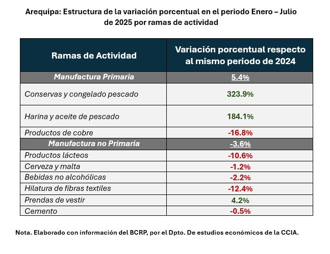Asimismo, al analizar la variación por ramas de actividad, se observa que la manufactura arequipeña presentó un comportamiento diferenciado durante 2025. La manufactura primaria creció 5.4%, impulsada principalmente por el notable desempeño de la industria pesquera, que registró incrementos extraordinarios en la producción de conservas y pescado congelado (323.9 %) y de harina y aceite de pescado (184.1 %), favorecida por una temporada de pesca más intensa y una mayor demanda exportadora. En contraste, la manufactura no primaria retrocedió 3.6%, afectada por la menor producción de productos lácteos (-10.6%), hilatura de fibras textiles (-12.4%) y bebidas no alcohólicas (-2.2%), rubros vinculados principalmente al consumo interno. Pese a esta dinámica contrastante, destacan las prendas de vestir (4.2%), que mostraron señales de recuperación asociadas al dinamismo del comercio y la diversificación de la oferta textil local.
