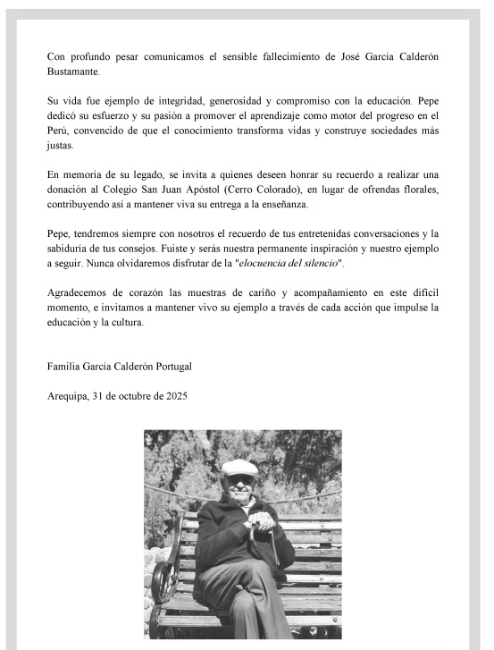 A lo largo de su vida, don José García-Calderón Bustamante, con 103 años, ha sido más que un abogado, alcalde o empresario. Es un símbolo de una generación que entendió el desarrollo no solo como progreso económico, sino como servicio, responsabilidad y amor por la tierra natal. Su centenario se aproxima, y con él, la oportunidad de rendir homenaje a un hombre cuya huella —como sus obras— permanece grabada en la historia viva de Arequipa.