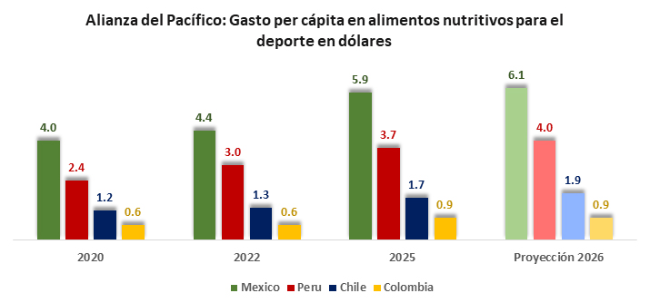 Asimismo, el gasto per cápita en alimentos nutricionales para el deporte revela un crecimiento sostenido en la región, impulsado por la evolución de los hábitos de consumo y la diversificación del mercado saludable. En México, el gasto proyectado de 6.1 dólares al 2026 confirma su liderazgo regional, sustentado en una amplia oferta de marcas internacionales, una sólida infraestructura deportiva y la expansión del comercio electrónico que facilita el acceso a suplementos especializados.