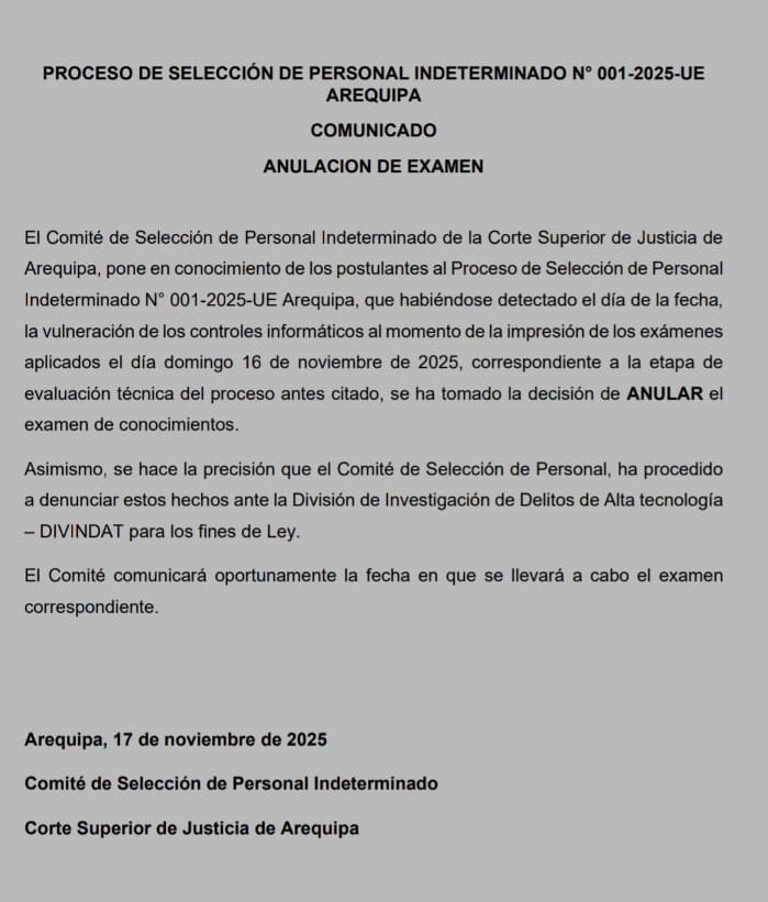 La Corte Superior de Justicia de Arequipa anuló el examen para acceder a una plaza indeterminada luego de confirmarse la filtración de la prueba aplicada el domingo 16 de noviembre. Más de 2 400 postulantes quedaron afectados por un hecho que expone fallas graves en el control y custodia de un proceso que debía ser transparente y riguroso.