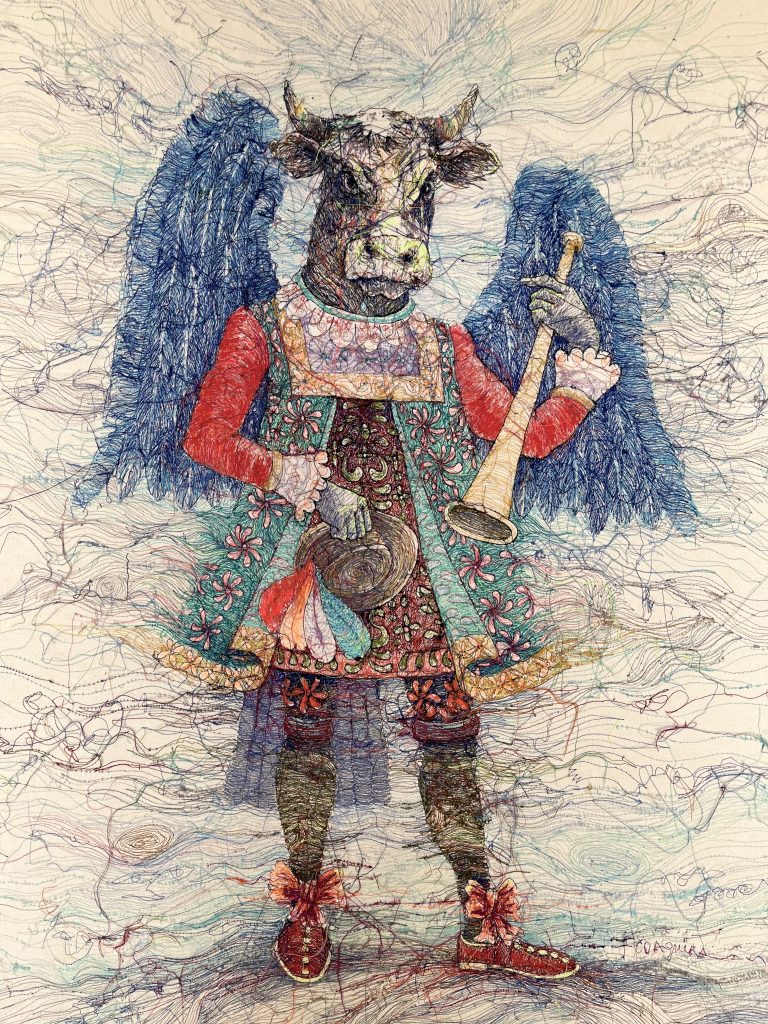 En mi caso, el arte textil fluye y dialoga desde la raíz fundamental propia de una realidad como la nuestra, una realidad  constituida por culturas diversas. Son las fibras y otras posibilidades del textil las que me permiten construir narrativas, partiendo de una estética del bordado, con una variedad de simbolismos, personajes de ficción y un lenguaje visual contemporáneo que conecta las tradiciones del pasado con el presente.