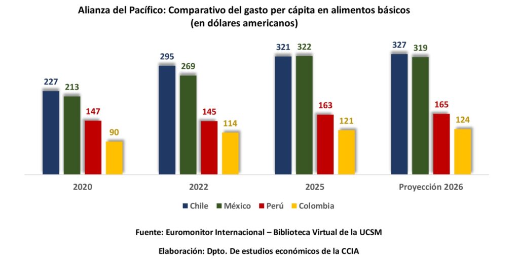 Adicionalmente, la comparación del gasto per cápita en alimentos básicos dentro de la Alianza del Pacífico permite ubicar el consumo peruano en un contexto regional y evidenciar sus diferencias frente a economías comparables. En 2025, el gasto per cápita en Perú se ubica en torno a USD 163, por debajo de Chile y México, que alcanzan aproximadamente USD 321 y USD 322, respectivamente; y por encima de Colombia, con cerca de USD 121. Estas diferencias se explican principalmente por los distintos niveles de ingreso, el grado de formalización del consumo y la mayor penetración de canales modernos en economías como Chile y México, factores que elevan el gasto promedio por persona.