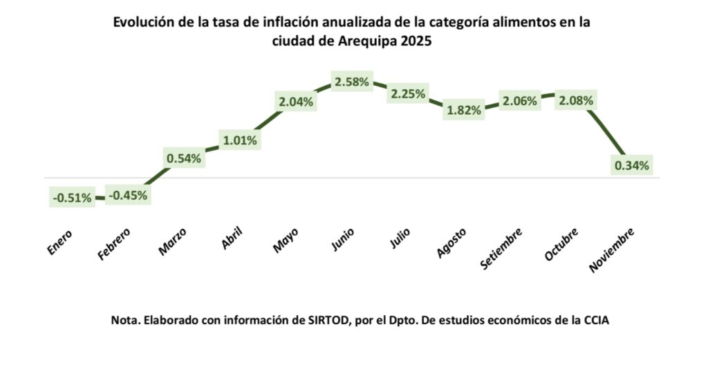 Por otra parte, al revisar la evolución de la inflación de alimentos en la ciudad de Arequipa, se observa un patrón que complementa y cierra el análisis del mercado de alimentos básicos dentro de un contexto local específico. La tasa de inflación anualizada en Arequipa presentó variaciones a lo largo de 2025, alcanzando su punto más alto a mediados de año y moderándose hacia noviembre; mes en el que la tasa de inflación de los precios de alimentos se situó cerca de 0.34%. Este comportamiento refleja una menor presión de precios en la segunda parte del año, en línea con la tendencia general de moderación inflacionaria observada a nivel nacional; donde la inflación total se mantuvo dentro del rango meta y los alimentos dentro del hogar tuvieron aumentos moderados durante 2025.