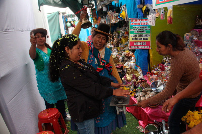 En el estadio Melgar también se comercializan estos productos, donde las maestras y curanderas bolivianas Carmina y Lucero de Amor realizan baños de limpieza con huevo y rituales de florecimiento, además de ofrecer alasitas.