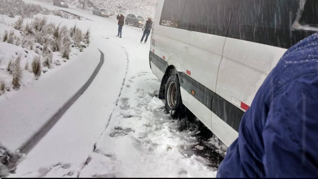 Una intensa nevada registrada desde la tarde del 27 de diciembre paralizó el tránsito vehicular en la carretera Arequipa–Juliaca, dejando varados a decenas de buses interprovinciales, camiones de carga y vehículos particulares que se desplazaban entre ambas regiones del sur. La acumulación de nieve cubrió completamente la calzada en varios tramos de la vía, especialmente en zonas altas, donde las temperaturas descendieron por debajo de los cero grados.