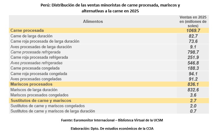Asimismo, en 2025 el valor acumulado de las ventas minoristas de carnes procesadas, mariscos procesados y sustitutos de carne y mariscos ascendió a aproximadamente 1,908 millones de soles, evidenciando una estructura de mercado dominada por productos de consumo tradicional y alta rotación. Dentro de este total, la carne procesada concentra la mayor participación, con más de 1,069 millones de soles, resultado de su amplia penetración en la dieta diaria, su disponibilidad en diversos canales de venta.
