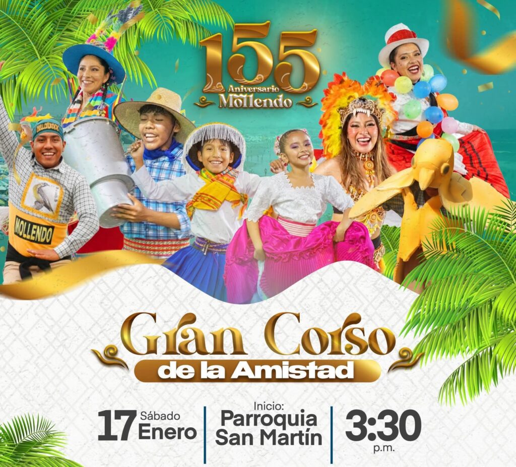Este sábado 17 de enero, Mollendo celebra sus 155 años de aniversario con el esperado Gran Corso de la Amistad, una fiesta que promete llenar las calles de color, alegría y orgullo mollendino. El desfile iniciará a las 3:30 de la tarde desde la Parroquia San Martín, convocando al público en general para celebrar juntos a la querida ciudad costera. La celebración continúa el domingo 18 de enero con el Festidanzas 2026, un encuentro que reunirá diversas expresiones de danza y tradición desde las 5:00 p. m. en el Estadio Municipal de Mollendo.
