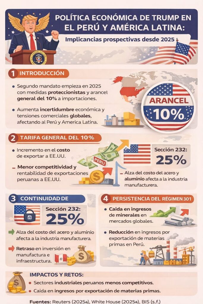 A diferencia de los análisis retrospectivos centrados en su primer periodo (2017–2021), esta mirada se enfoca en las implicancias prospectivas de las políticas aplicadas desde 2025, en un contexto de mayor fragmentación geopolítica y volatilidad económica. La adopción de medidas como el arancel general del 10% a las importaciones, la continuidad de la Sección 232 para acero y aluminio, y la persistencia de la disputa comercial con China, generan un entorno internacional más incierto, con riesgos y oportunidades para las economías de la región, sostiene el economista David Espinoza Riega, consultor y asesor en inversiones.