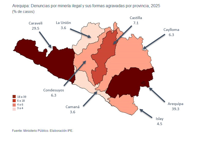La provincia de Arequipa concentra casi la mitad de estos casos, lo que la convierte en el principal foco de actividad minera informal e ilegal del sur peruano. De acuerdo con el Instituto Geológico, Minero y Metalúrgico (Ingemmet), la región cuenta con 157 yacimientos auríferos, el mayor número a nivel nacional.