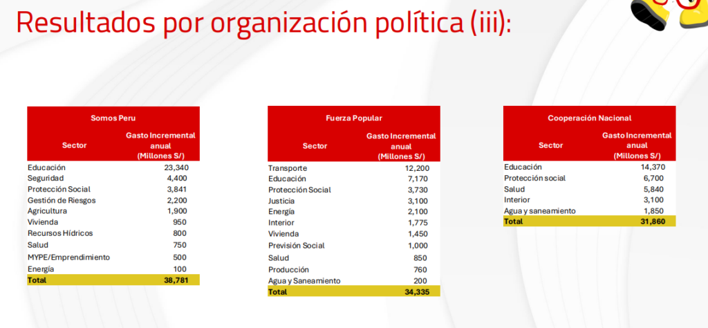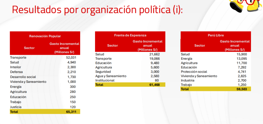 Perú Libre, por su parte, plantea un gasto adicional de S/59.503 millones, dirigido principalmente a energía (S/13.095 millones), agricultura (S/11.700 millones) y salud (S/15.900 millones), con una fuerte apuesta por el fortalecimiento del Estado como motor de desarrollo.