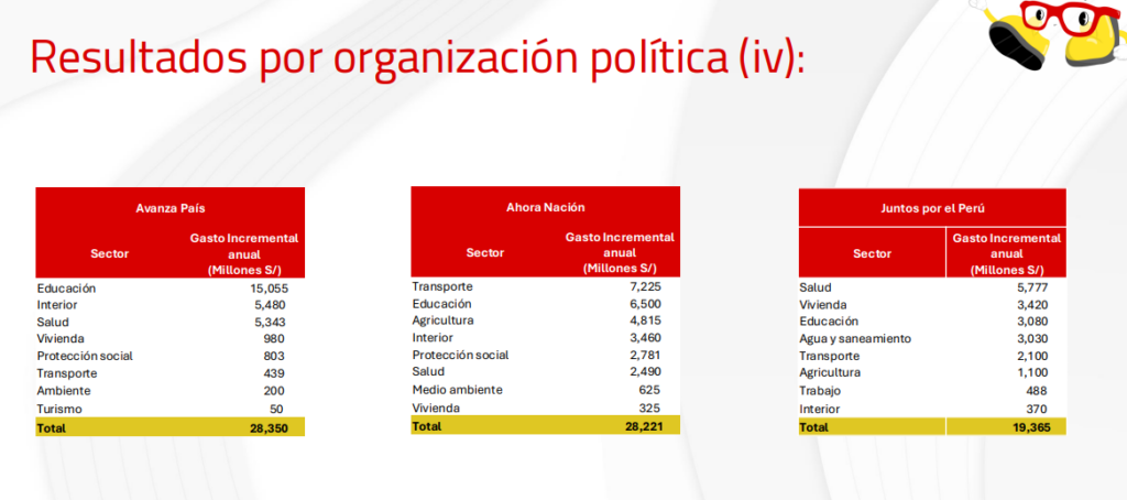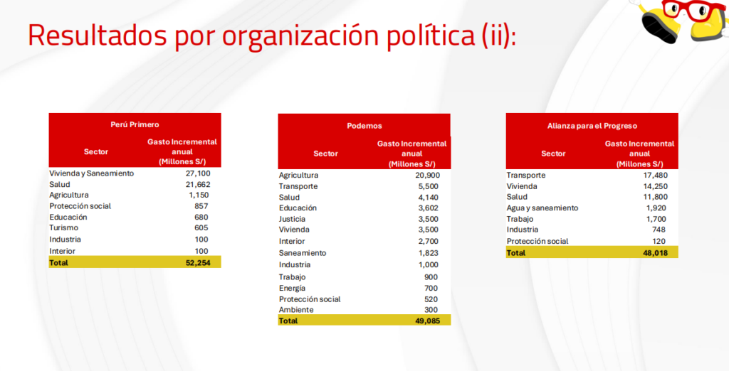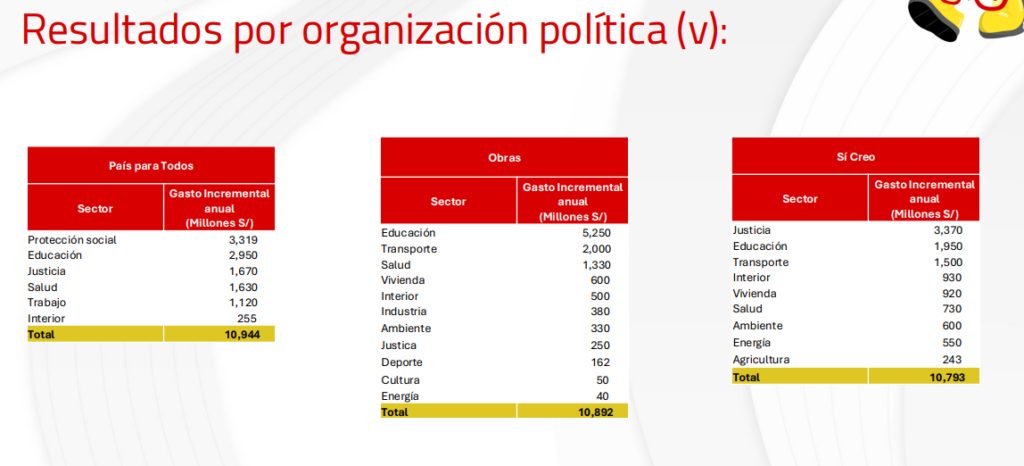 En contraste, Sí Creo (S/10.793 millones), Obras (S/10.892 millones) y País para Todos (S/10.944 millones) destacan por presentar planes más acotados y financieramente sostenibles, con propuestas centradas en justicia, educación y programas sociales.