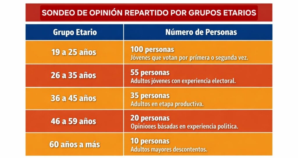 El sondeo contó con la participación de 220 personas, distribuidas en grupos etarios, 100 personas entre 19 y 25 años, 55 entre 26 y 35 años, 35 entre 36 y 45 años, 20 entre 46 y 59 años y 10 personas de 60 años a más. Este enfoque permitió identificar percepciones diferenciadas, así como puntos de coincidencia entre generaciones respecto al desempeño del Congreso.