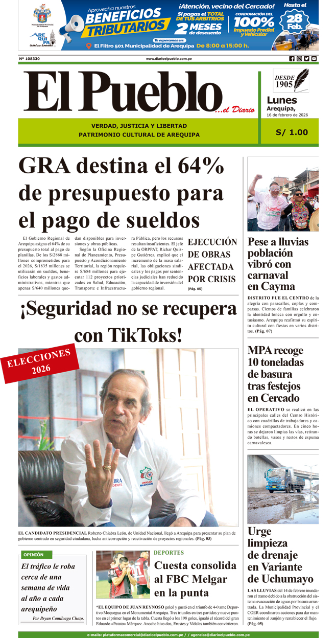 La Municipalidad Provincial de Arequipa (MPA) informó que alrededor de 10 toneladas de basura fueron recogidas por el personal de las áreas de Limpieza Pública y Parques y Jardines, luego de los festejos que se desarrollaron en el Cercado por el Día de San Valentín y las celebraciones de carnavales.