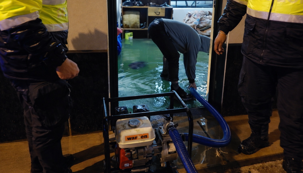 Para sacar el agua de una vivienda inundada se habilitó una motobomba.