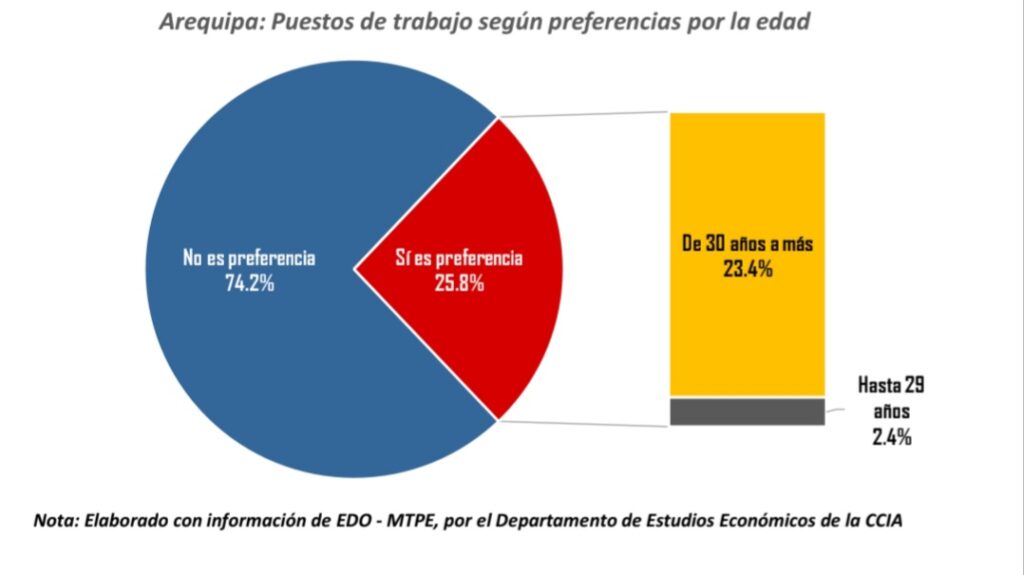 No obstante, un 25.8% de las empresas sí manifiesta preferencias etarias al momento de contratar personal. Dentro de este grupo, el 23.4% muestra una inclinación por trabajadores de 30 años a más, mientras que un 2.4% prefiere trabajadores de hasta 29 años. Esta distribución evidencia una clara preferencia por perfiles de mayor edad, lo cual sugiere que las empresas valoran la experiencia laboral acumulada, la madurez en la toma de decisiones y una mayor estabilidad en el desempeño de funciones, especialmente en puestos que requieren responsabilidad y continuidad.