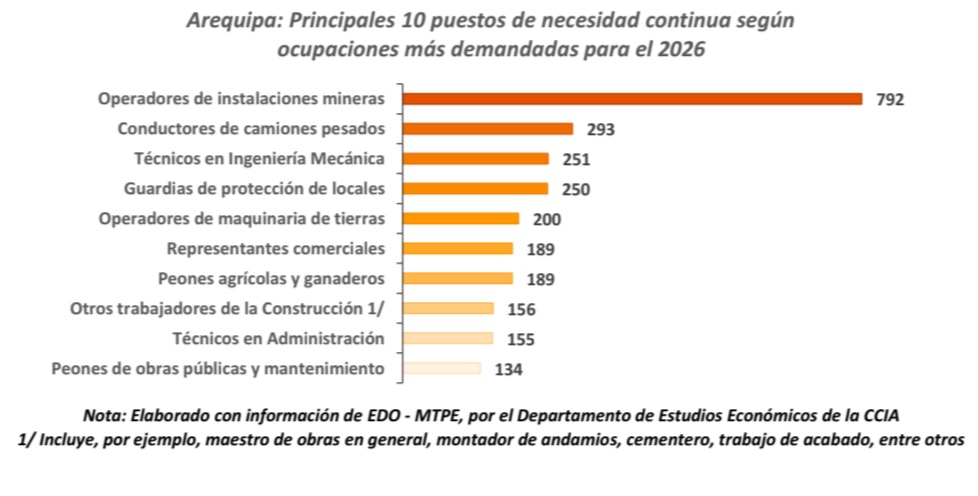 En relación con los puestos de necesidad continua, se prevé que haya 4 739 puestos de trabajo; en este segmento, las empresas demandan principalmente ocupaciones vinculadas a sectores estratégicos para la región, como la actividad minera. En este contexto, se observa una mayor necesidad de operadores de instalaciones mineras, conductores de camiones pesados, técnicos en ingeniería mecánica y personal de seguridad, como guardias de protección de locales. Asimismo, junto con estas ocupaciones, las empresas requieren que los trabajadores cuenten con determinadas capacitaciones, destacando entre las más solicitadas la técnica de ventas, el conocimiento de normas y procedimientos de seguridad, la seguridad y salud ocupacional, la seguridad minera, así como técnicas de perforación y voladura.