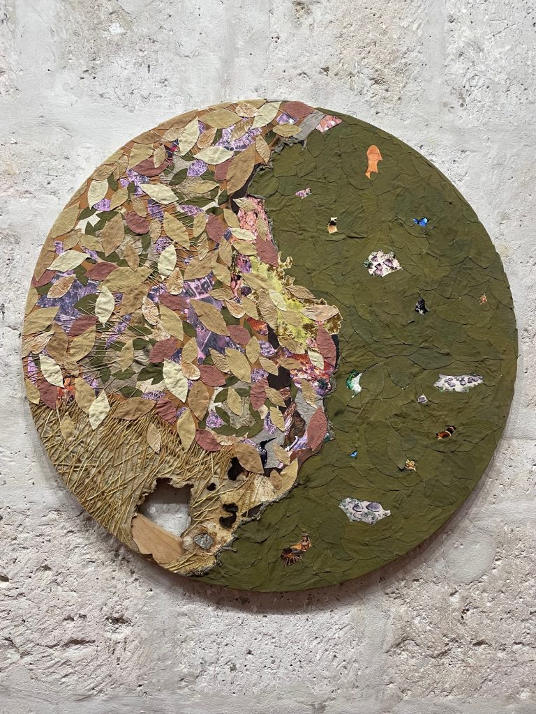 Desde el año 2014, me encuentro buscando materiales que no sean óleo, acrílico o derivados, porque soy alérgica. Este problema de salud me llevó a investigar sobre el bordado a mano, el teñido natural, la estampación botánica, entre otras técnicas. Actualmente, creo mis propios materiales, tiño mis telas, hilos y lanas, y selecciono otros que son reutilizados, como fotografías, postales, estampillas, etc.