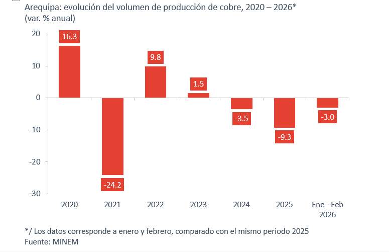 Durante el primer bimestre de 2026, la producción de cobre en Arequipa alcanzó las 62 mil toneladas, lo que representa una caída de 3% respecto al mismo periodo del año anterior. Aunque el descenso podría parecer moderado, confirma una tendencia negativa que se arrastra desde 2024. Ese año, la producción cayó 2.7%, mientras que en 2025 el retroceso fue de 2.6%. En términos absolutos, la región pasó de producir 453 mil toneladas en 2024 a 412 mil en 2025, una contracción de 9.3% que evidencia la pérdida de dinamismo del principal motor económico regional, refiere un reciente informe el Instituto Peruano de Economía.