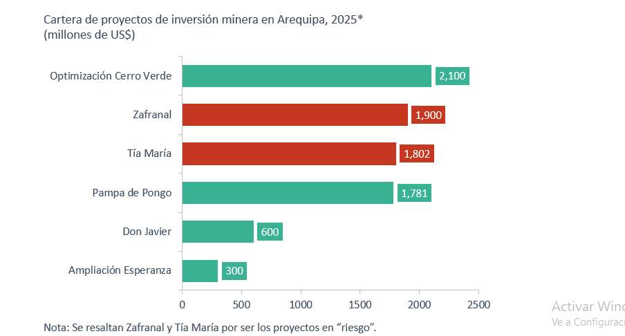El proyecto Tía María, que contemplaba inversiones por más de 1 800 millones de dólares hasta 2027, aún no inicia su explotación, lo que pone en duda su inicio de operaciones en el corto plazo. Por su parte, Zafranal, con una inversión estimada de 1 900 millones de dólares, permanece paralizado mientras se reevalúa su viabilidad económica. En conjunto, ambos proyectos representan más del 43% de la cartera de inversión minera en Arequipa, lo que dimensiona el impacto de sus retrasos.