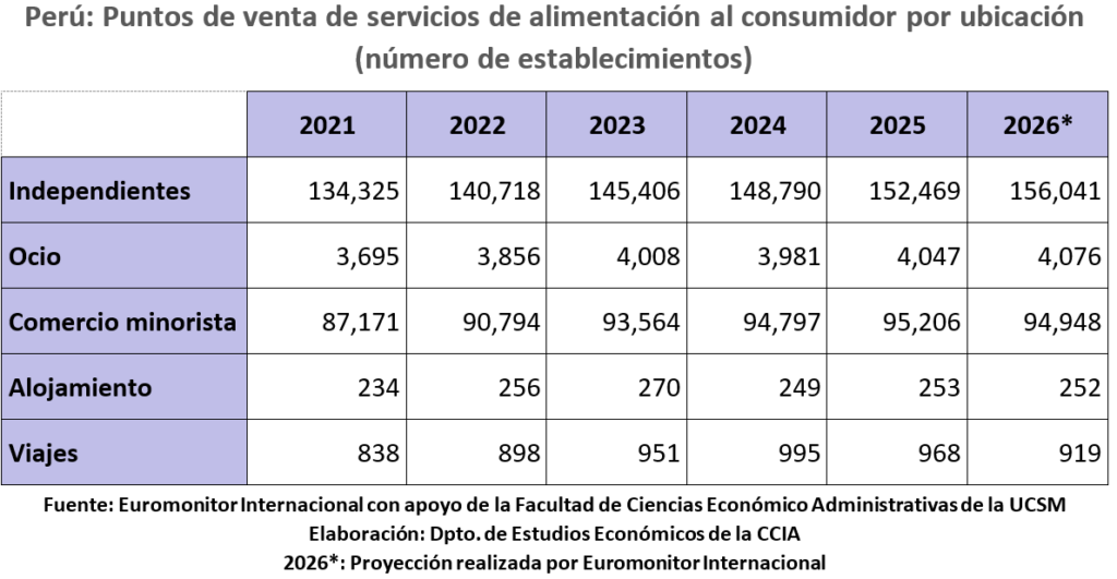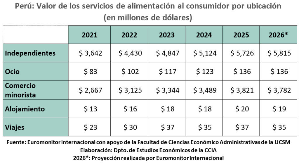 Los restaurantes independientes también crecieron un 2.5%, gracias a nuevas aperturas, la mayor demanda de cocina peruana y latinoamericana, y la mejora de la experiencia gastronómica mediante inversiones en instalaciones y seguridad. Además, estos establecimientos resultan especialmente viables, ya que pueden llegar a consumidores más allá de los centros comerciales, ubicándose en barrios residenciales o zonas comerciales con mejor acceso.