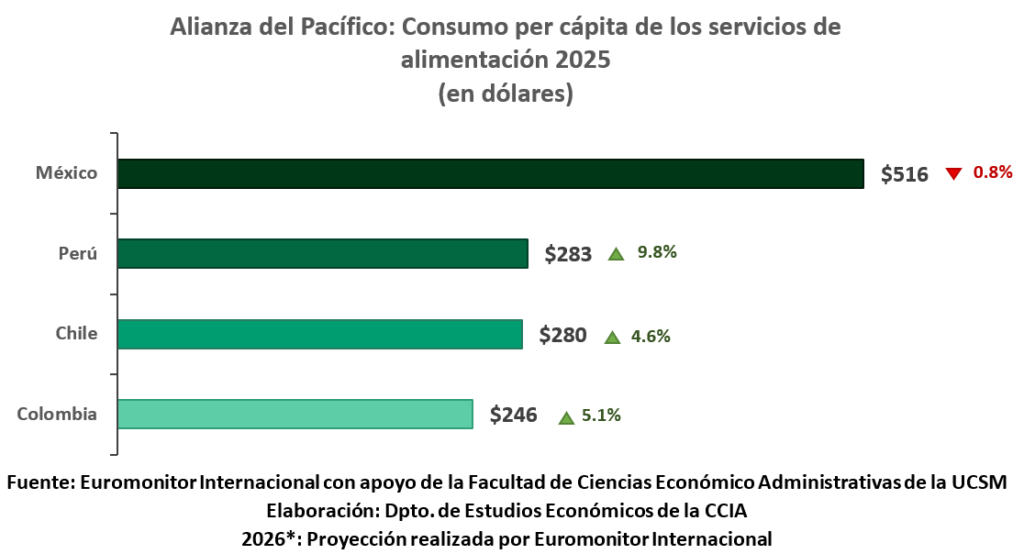 A diferencia del Perú, estos países presentan un menor consumo per cápita de los servicios de alimentación a través del ocio. Esto sugiere que, en dichos mercados, el consumo está más concentrado en canales tradicionales, mientras que en el caso peruano el componente experiencial, relacionado con el entretenimiento y las actividades recreativas, tiene un mayor peso relativo, evidenciando particularidades en los patrones de consumo y en la forma en que los consumidores destinan su gasto.